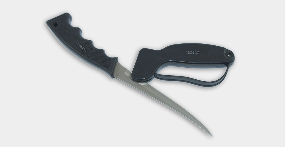 Cuchillo filetero con afilador fabricado en acero inoxidable. La hoja tiene filo cortante de larga duración. Punta flexible resistente. Incluye funda de seguridad y afilador de cuchillos.